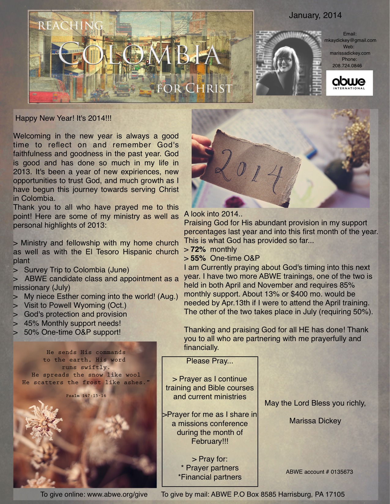 January Prayer Update January 30, 2014 · by marissadickey · in Prayer Letters. · *Click on image for larger view* Share this: Click to share on X (Opens in new window) X Click to share on Facebook (Opens in new window) Facebook Like Loading... Related