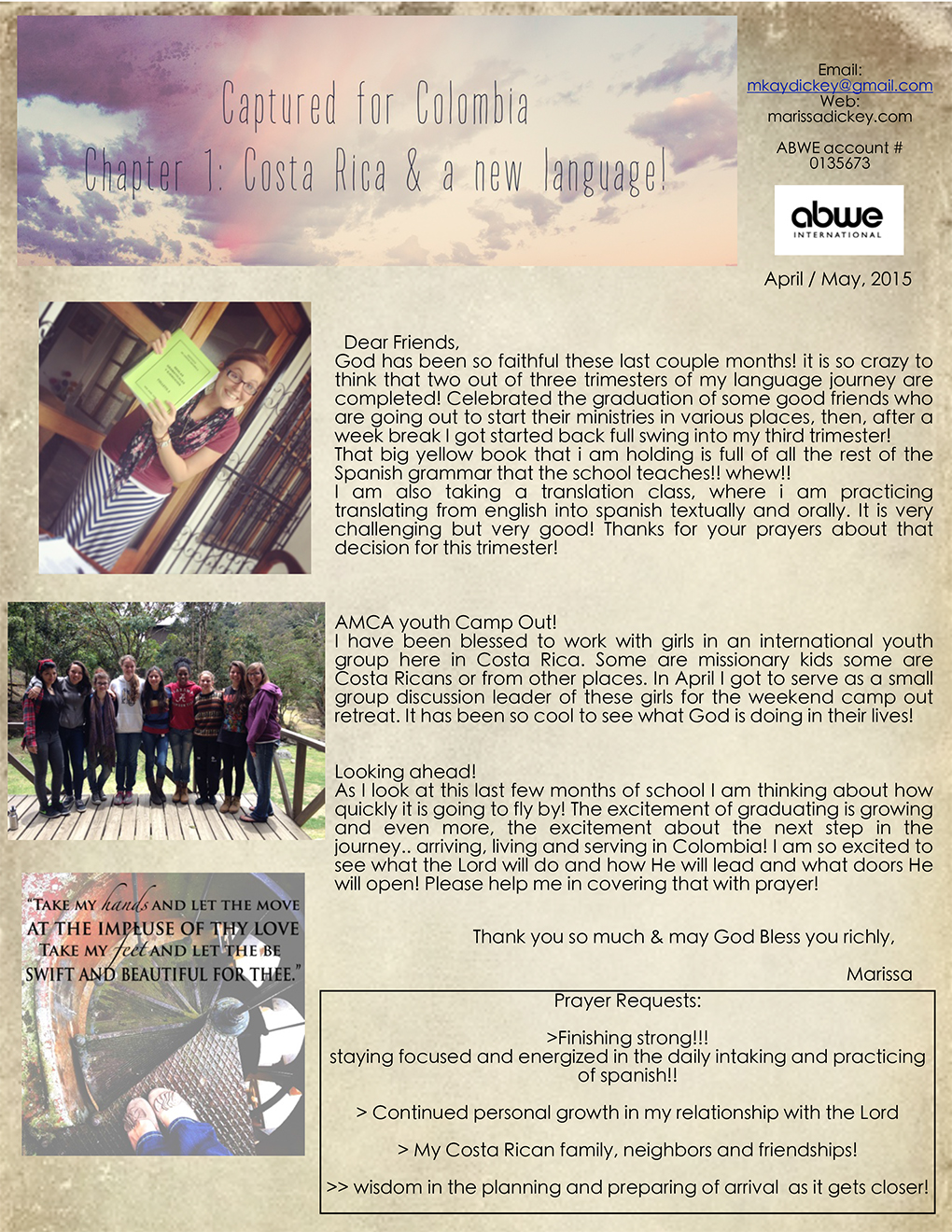 April/May Prayer Letter July 8, 2015 · by marissadickey · in Prayer Letters. · * Click on image for larger view Share this: Click to share on X (Opens in new window) X Click to share on Facebook (Opens in new window) Facebook Like Loading... Related